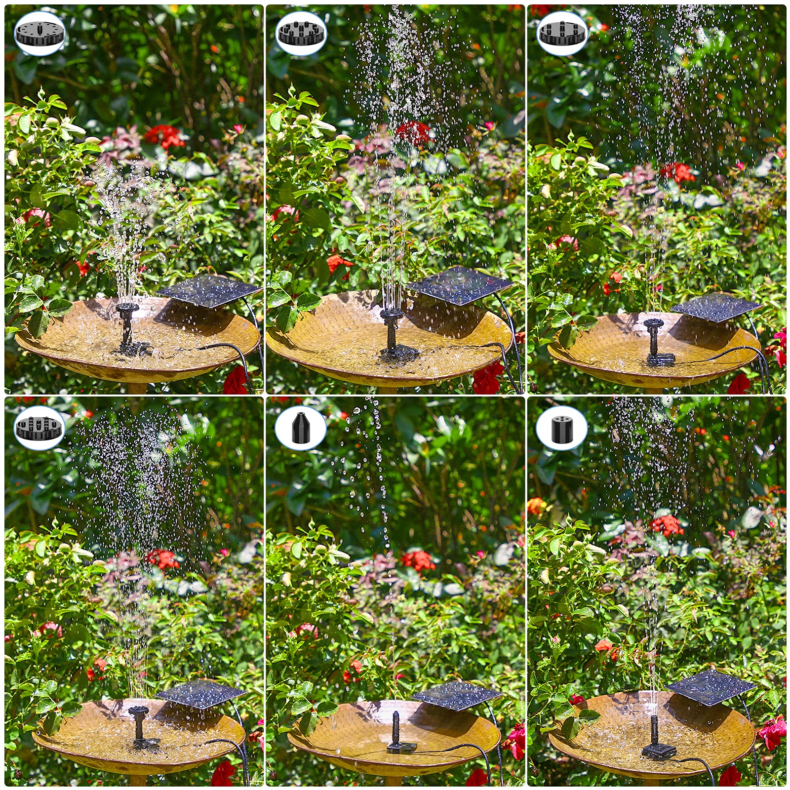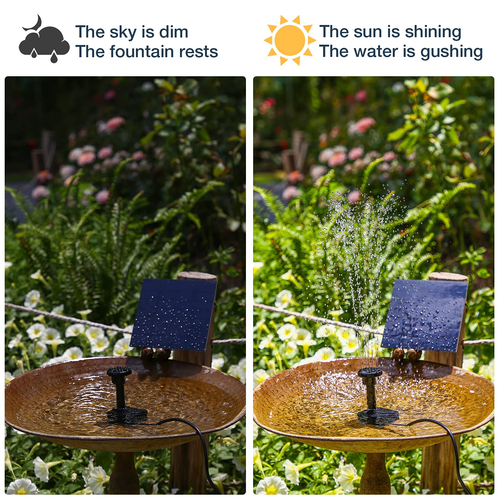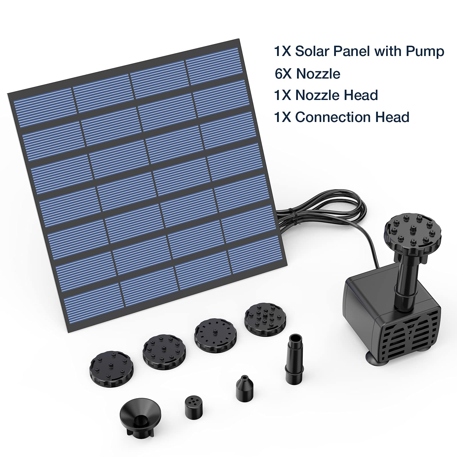 Awesome little water pumps! This little pump deserves 6 stars! Amazing durability. I’ve purchased two of these, thinking if I got just one to work a week, it would be worth the money. I’m simply blown away at the power and reliability of these small pumps. I have them in a bird bath, which I’m letting water drip into to keep it full. More than once, I have let the water get below the pump inlet. It has ran several days with no water and still works fine! After two months, both still work.Included are several different spray heads and extensions. Most spray the water 8 to 12 inches above the bath, really attracting the birds! The speed of the pump is of course directly related to the brightness of the sun on the small solar panels. The cord is plenty long (about 5 or 6 feet), so I have the bird bath in the shade, allowing the solar panels to reach sun. Would highly recommend this for small ponds or bird baths.