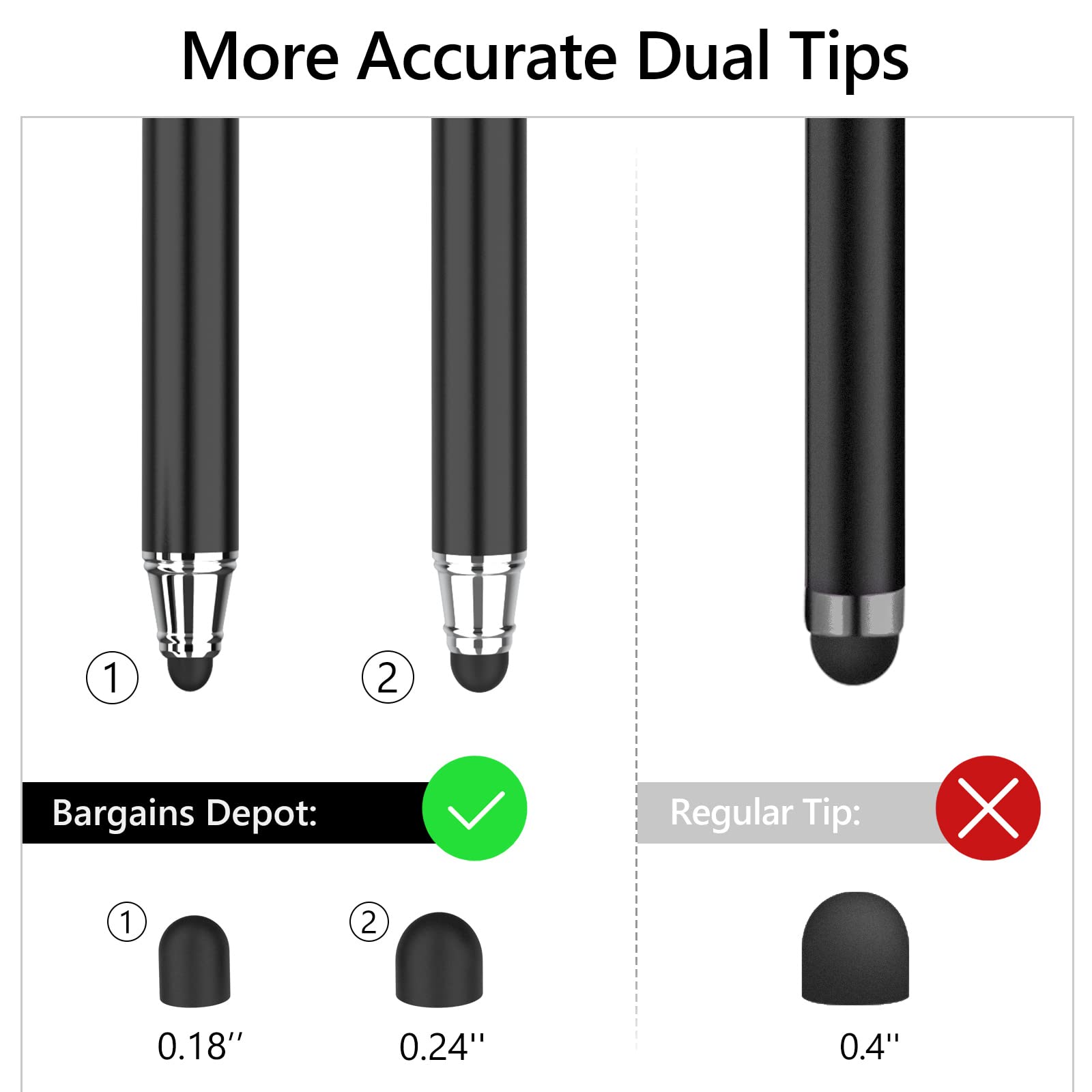 AWESOME!!! I once 5 years ago bought a smaller stylus that felt the same as this one but only had one side to it. I had paid twice the money for it. I loved it but hated it small size. About one month ago it finally died a slow painful death. I was just so devastated.I had come back to Amazon, to my account, to try to find the exact stylus I had purchased before. Sadly, it was lost to my many many purchases, I am an Amazon junkie. So I become desperate being I have no feeling in my fingertips, I spend a lot of money on a piece of junk that did not work well in the first place, at a well known local retail drug store chain. Then a little money at the local Walmart. Again, trash.I then try again, my favorite, Amazon, and the search begins. I come across this wonderful BARGAINS DEPOT STYLUS.Now about this wonderful BARGAINS DEPOT STYLUS1. The great price, only $6.992. You do not get just 1 stylus, you get 2, but you don't get 2 you get 4. WHAT? You get a total 2 stylus with 2 ends on each of them. It's like having a total of 4 stylus in all.BUT WAIT... That's not all...3. It also comes with... wait for it... 10 extra replacement rubber tips...yes... 10 extra replacement rubber tips!!!That is like getting a total of 14 stylus for $6.99.I love the price. I love the feel of the balance. It is well-made and strong quality all metal, not plastic. It is longer, about the length of your cell phone. I like that. I forgot to mention, the two ends are two different sizes. One size is smaller than the other side. You may also buy 2 more sizes rubber tips 0.24, 15 for $5.99 0r 20 for $6.99.Did I fail to mention this feels great, is a metal not plastic, quality made. Awesome well balanced, I just love this product!!!Works great on my Android phone!This is just my opinion and nobody has given me anything or has sent me anything for my opinion or review. I just bought just this item on 9/22/2018 and received on 9/25/2018. These facts are true as of the date as they are summited. Thank you.