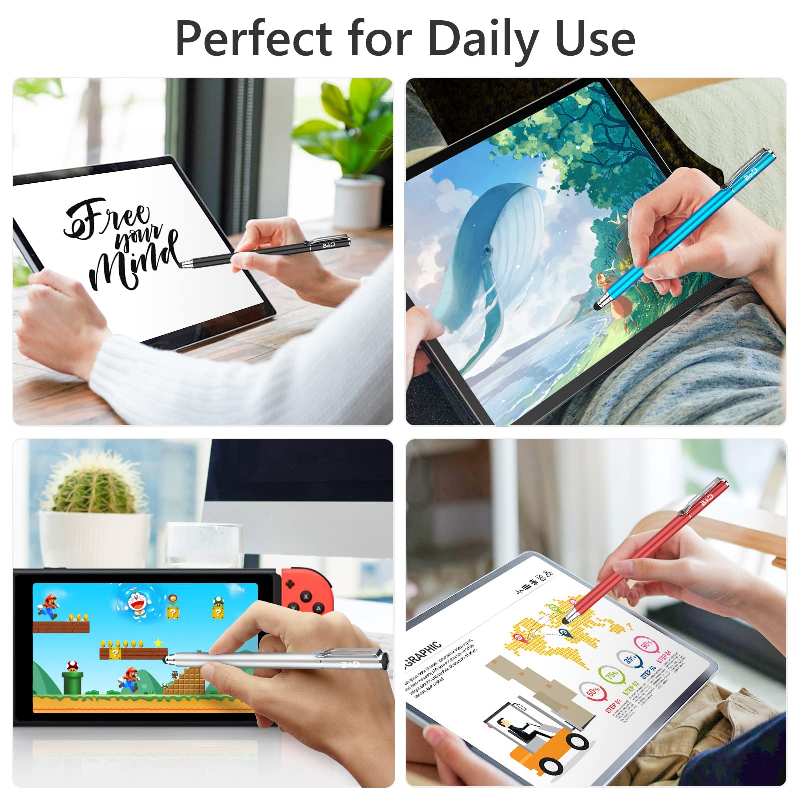 Best stylus pen you can buy with spare tips! I love these stylus pens! As all stylus pens do, the tip will eventually tear or wear off. This set comes with extra tips that are easy to replace. There are 2 sizes, a fine point which I use with my iPhone and a larger tip that I use with my iPad. Best purchase I’ve made in a long time and definitely great price for what you get.