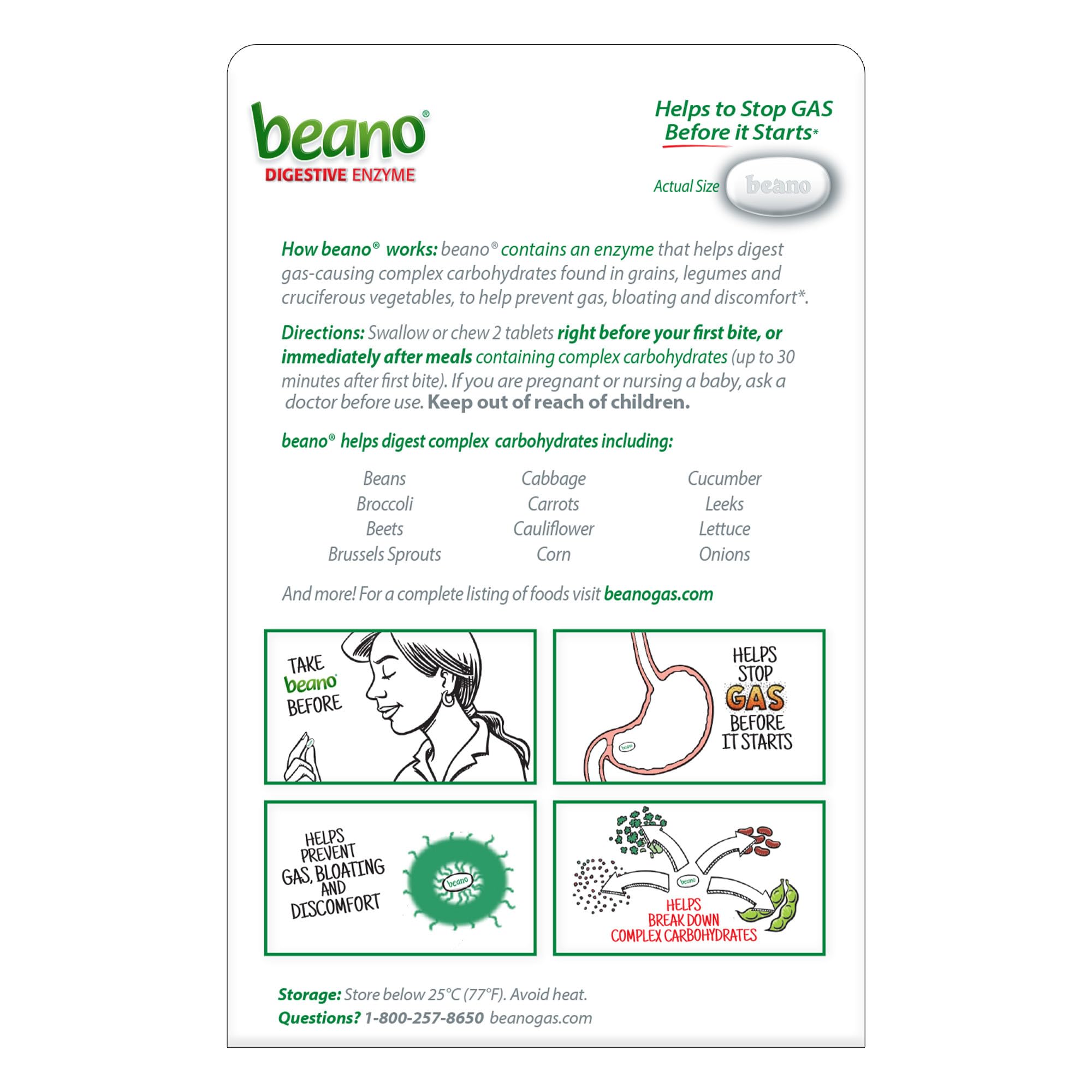 Beano is a dietary supplement, not a medication Beano is an over-the-counter dietary supplement designed to help prevent gas, bloating, and discomfort caused by eating certain foods. It contains a natural enzyme called alpha-galactosidase (α-GAL).How Beano WorksMany healthy foods, such as beans, vegetables (like broccoli, cabbage, and onions), and whole grains, contain complex carbohydrates (oligosaccharides and polysaccharides) that your body can't fully digest on its own. When these undigested carbohydrates reach the large intestine, bacteria break them down, producing gas as a byproduct.Beano's alpha-galactosidase enzyme works in your digestive tract to break down these complex carbohydrates into simpler, more easily digestible sugars before they reach your colon. This process helps prevent gas from forming in the first place.Key Uses and BenefitsGas Prevention: Beano is specifically used to prevent gas, bloating, and discomfort associated with eating gas-producing foods.Digestive Support: It helps your body digest foods more efficiently, reducing occasional digestive discomfort.Wide Range of Foods: While commonly associated with beans, Beano can help with a variety of foods, including:Vegetables: Broccoli, cabbage, cauliflower, carrots, corn, lettuce, onions, peppers, Brussels sprouts, beets, leeks.Legumes: Beans (black-eyed peas, chickpeas, lima beans, pinto beans, kidney beans), lentils, peanuts, and soy products.Grains: Whole-grain breads, pasta, oat bran, barley, rye, sorghum grain, breakfast cereals, granola.How to Take BeanoIt's important to take Beano at the right time for it to be effective:When to Take: Take Beano right before your first bite of the gas-causing food, or as you are eating it. Taking it too late might not give the enzyme enough time to work.Dosage: The typical recommended dose is 2-3 tablets per meal, or 1 tablet per serving of problem food. You might need to adjust the number of tablets based on the amount of gas-causing food you consume.Formulations: Beano is available in tablets (which can be swallowed whole or chewed) and "Meltaways" (strawberry-flavored tablets that dissolve on your tongue).Heat Sensitivity: The enzyme in Beano can be inactivated by high heat, so do not cook with Beano or add it to hot foods.Important Considerations and Side EffectsNot a Drug: Beano is a dietary supplement, not a medication.Allergies: If you have a rare sensitivity to the ingredients (which can be derived from Aspergillus niger, a fungus), discontinue use. Individuals with galactosemia should consult their doctor before using Beano.Pregnancy/Breastfeeding: While there's no information to suggest Beano is unsafe during pregnancy or breastfeeding, it's always recommended to consult your doctor before use if you are pregnant or nursing.Diabetes: Beano breaks down complex sugars into simpler ones. While it adds a small number of carbohydrates, diabetics should consult their physician regarding its use and how it might affect blood glucose levels.Side Effects: Beano is generally well-tolerated. Rare side effects can include allergic reactions (rash, hives, itching, swelling) or minor gastrointestinal discomfort. If you experience severe or persistent side effects, contact your doctor.Gas-X vs. Beano: It's important to note that Beano works differently than gas relief products like Gas-X (which contains simethicone). Beano prevents gas by breaking down indigestible sugars, while simethicone helps break up existing gas bubbles.Always talk to your pharmacist or doctor before starting Beano or any new supplement, especially if you have existing medical conditions or are taking other medications.