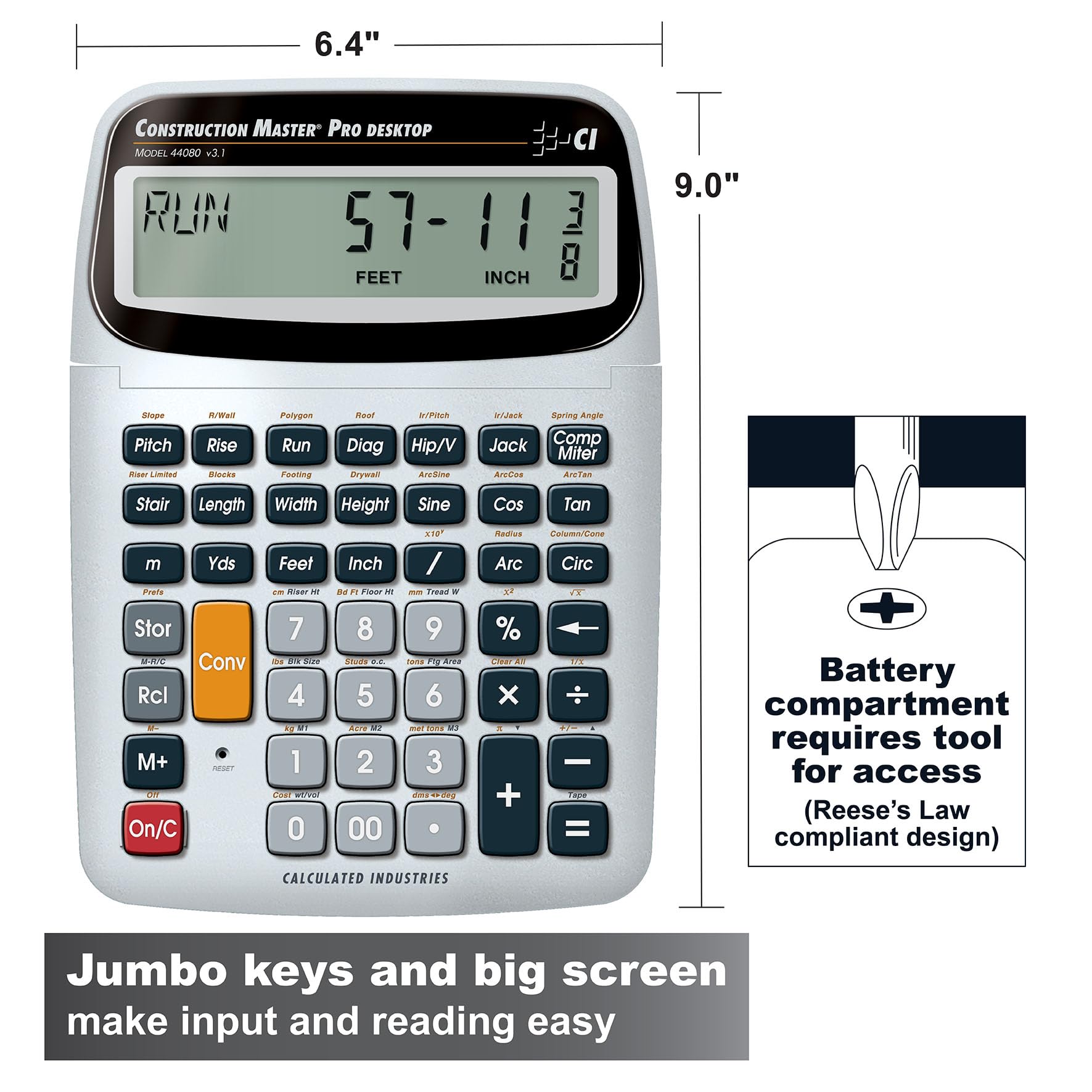 Why settle for less when you can have the best? This desktop calculator is engineered with advanced feet-inch-fraction capabilities and a built-in Trig tool, making it indispensable for architects, estimators, contractors, builders, and remodelers. From calculating material quantities to complex angles, the Construction Master Pro-Desktop handles it all with speed and precision. Imagine completing estimates faster, reducing material waste, and winning more bids. That’s the power of having the right tool.