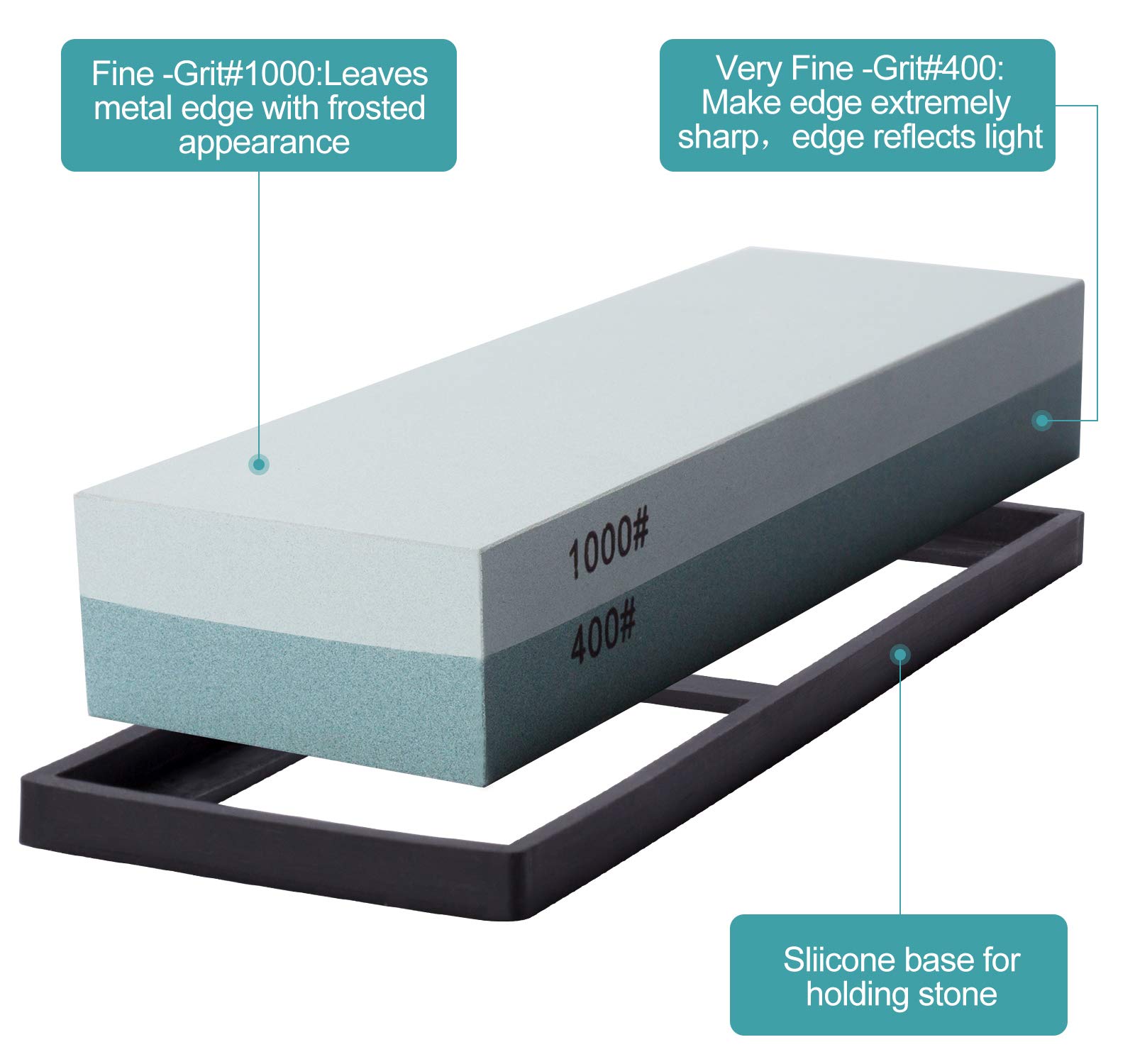 Great value for this stone. I was using a handheld self-sharpening type like you find in the store which was suddenly damaging the knife edge. I wanted to go back to using a stone type that I know would work well from prior experience. This particular one I chose for shipping speed as it looked similar to other well-reviewed versions with slower delivery timing. It only had one review but looked decent enough in the photos. Simple and easy to store. The included silicone bumper is enough to hold it steady while using (provided you didn't get water underneath of it). I sharpened 4 knives, all with damaged edges to a smooth, sharp blade in less than 20 minutes - including setup. The knives would then slice thin paper cleanly in one swipe. I tested the knives on vegetables and meat afterwards. I was more than satisfied with the quality of the cuts, even after so little time on the stone. One complaint: (and I would pay a bit more for this) is that it doesn't come with a storage pouch. Other than that, it works and it's a decent price.
