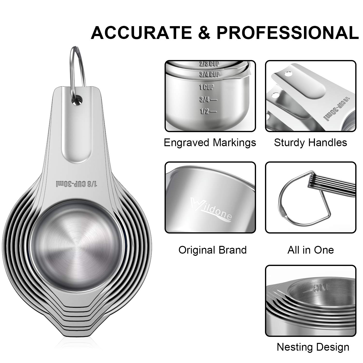 Excellant quality Wildone measuring cups and spoons are high quality. The cups are a good weight and each one came plastic wrapped individually so no scratching each other. Cups nest really well within each other, so do the spoons. Spoons came wrapped in one plastic bag with a tie wrap to keep them from moving around and scratching. The product looks just like the photos show them. I like that all of them are made out of one piece of metal each, no nooks and crannies where ingredients can get caught and not washed. Smooth brush interiors for the cups. There are no sharp edges to the cups or spoons. The spoon heads are slim,elongated and fit well into the standard size store bought spice bottles. Nice long handles on the spoons. I like that the cups have more than one measurement that is etched on the outside but you can also see the etching on the inside. For example,. the 1 cup has markings for 3/4 and 1/2 cup too. So one cup can be used for multiple measurements and or if you used your 3/4 cup and it's dirty now, and you need 3/4 cup of another ingredient, you can pull out the 1 cup to use it as a 3/4 measuring cup. So versatile.I have bought other SS measuring cups and spoons here but I have to say these are very good quality. They will last for years. Very sturdy and well made. The cups and spoons are held together by a D ring. The smidgen set is held together by metal link chain.
