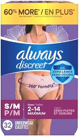 Always Discreet Adult Incontinence Underwear for Women and Postpartum Underwear, Small/Medium, Up to 100% Bladder Leak Protection, 32 Count