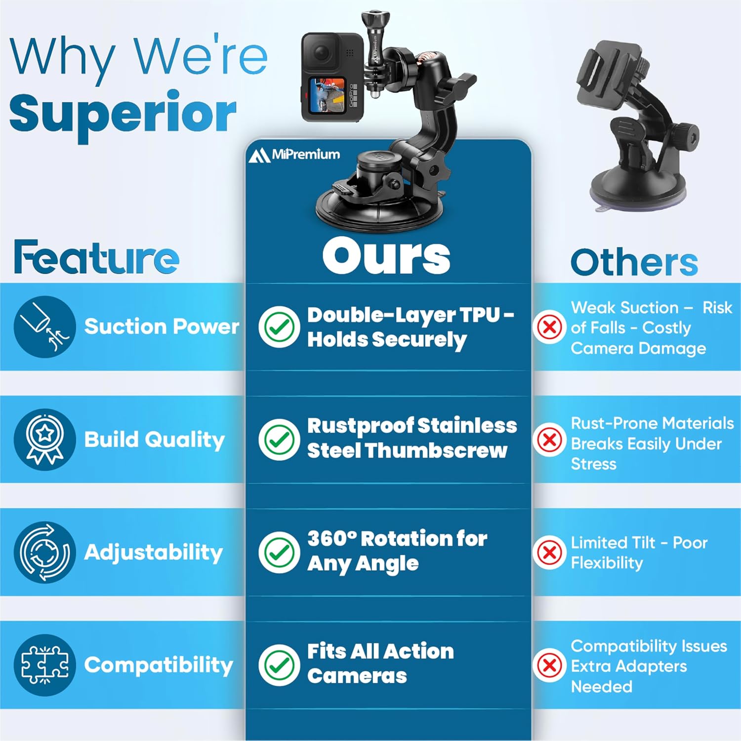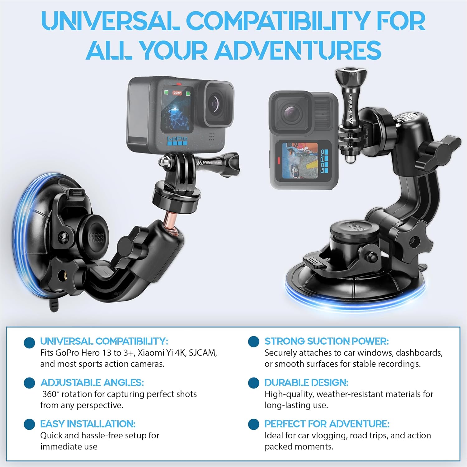 MiPremium Car Suction Cup Mount for GoPro Hero 13 12 11 10 9 8 7 6 5 4 3 3+ 2 Session Black Silver XIAOYI 4K SJCAM Yi Sports Action Camera Dash Cam holder perfect for Boats Vehicle Windshield & Window