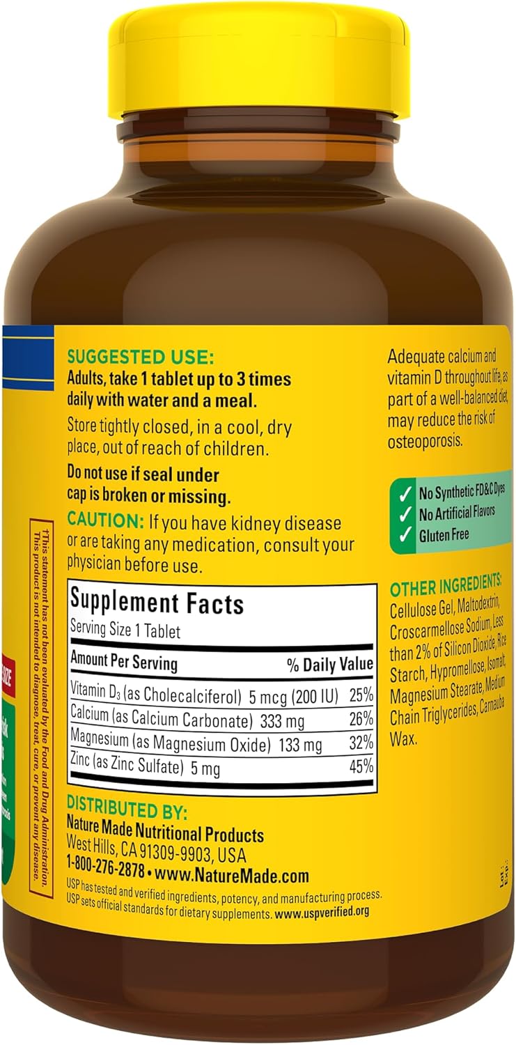 Nature Made Calcium Magnesium Zinc with Vitamin D3, Dietary Supplement for Bone Support, 300 Tablets
